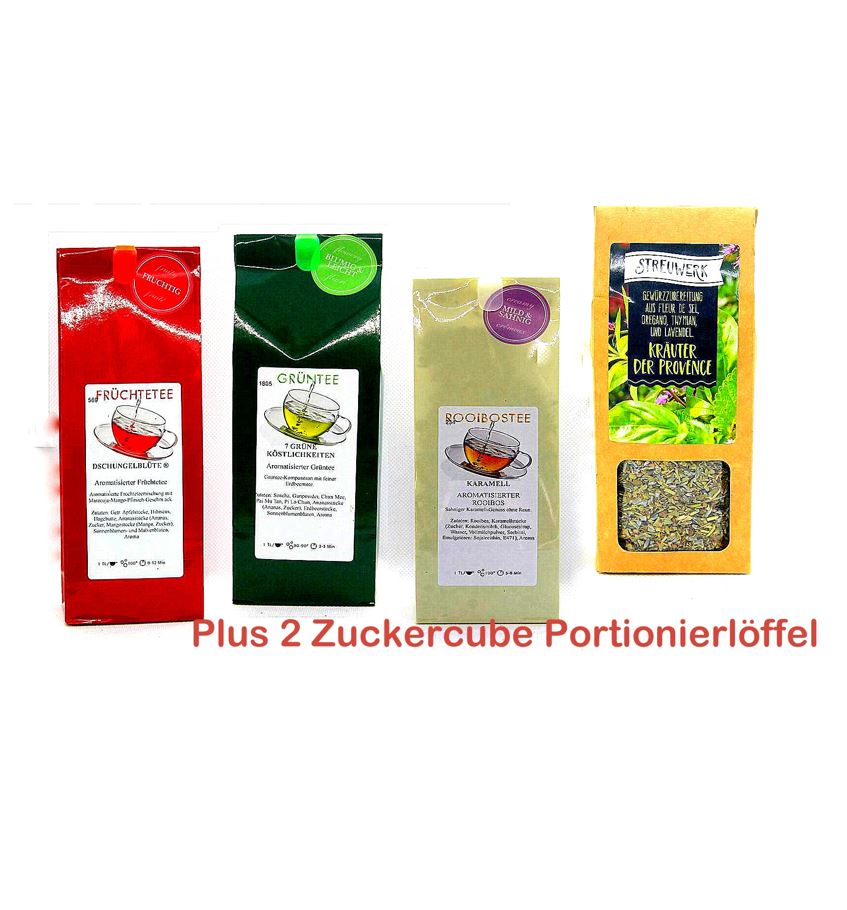 Das perfekte Präsent für jedermann. Eine zufällige Zusammenstellung von 3 Sorten Tee a 100g, 1er Sorte Gewürz a 100g und 2 stylischen Zuckercube Portionierlöffeln.